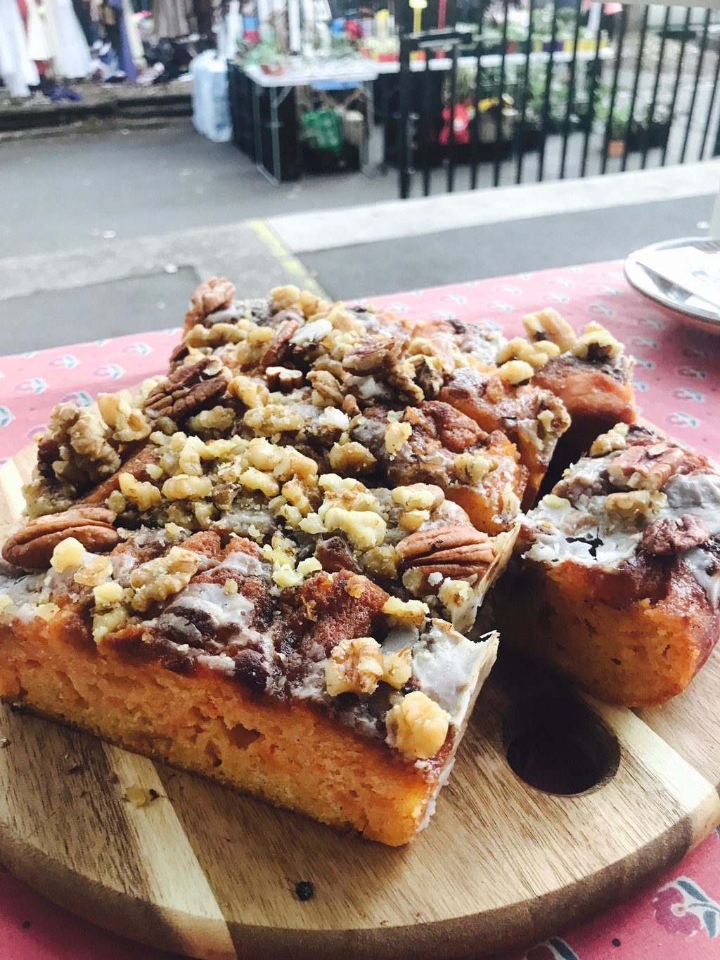While the slab is still warm, drizzle half of the glaze over the top. Scatter the pecans, crushing some in your hands, and then drizzle the remaining glaze on top. Finish with a pinch of cinnamon if desired.