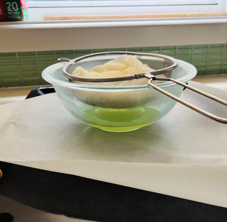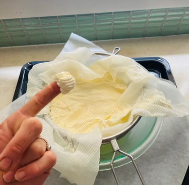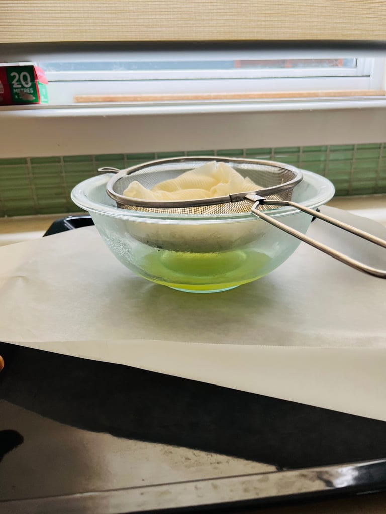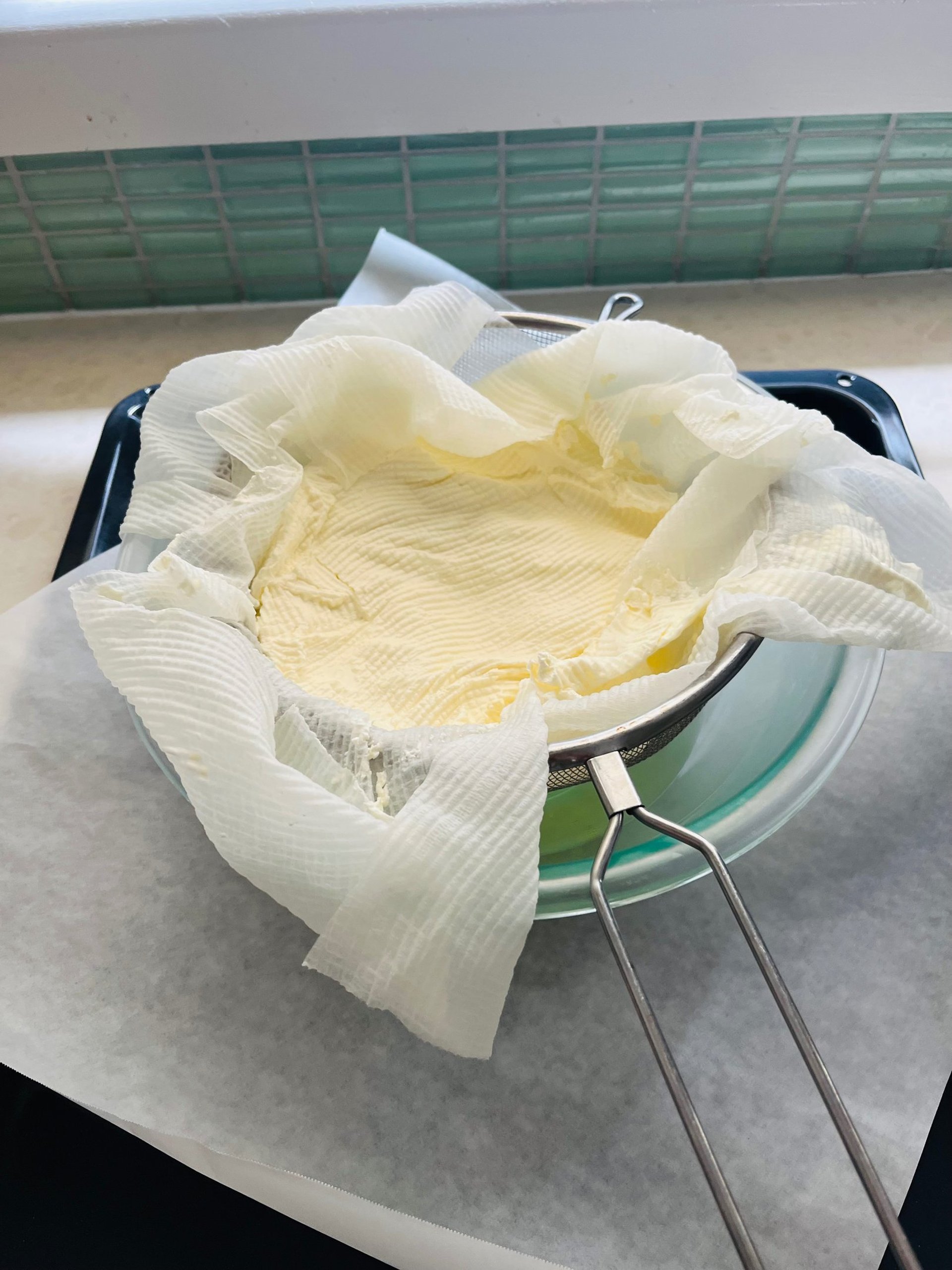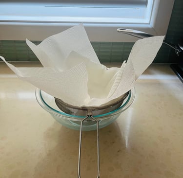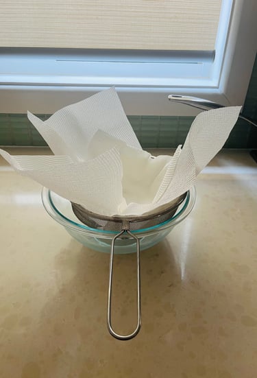 Over a medium size deep bowl, set a sieve lined with 3 layer of paper towel, allowing for a generous overhang on all sides.