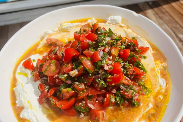 Serve in wraps, pitas, sandwiches... in salads, in puff pastry tarts, with roast veggies, on a cheese board, or as pictured below, underneath a bed of marinated tomatoes.