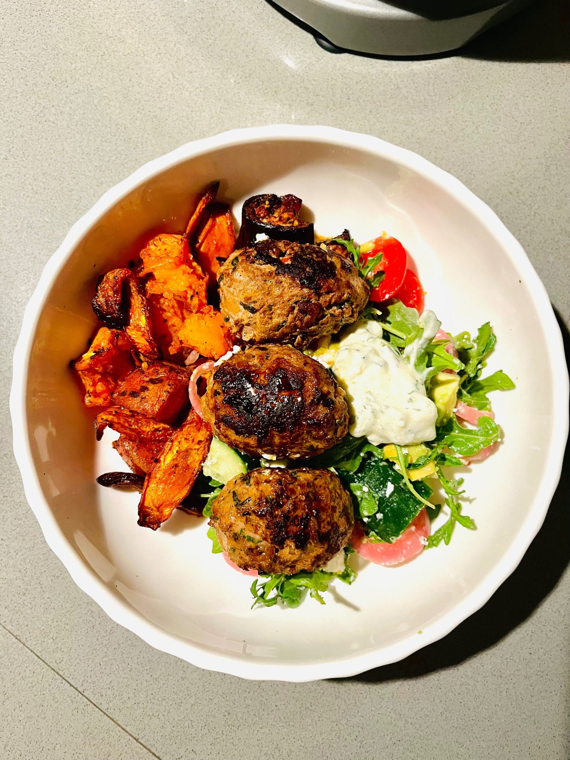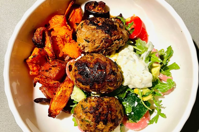This is the type of meal that always hits the spot. It's full of flavour, healthy and hearty, yet somehow it's still light. It is versatile and easy to prepare. Perfect for lunch or dinner, and great for meal prep. The koftas are succulent and juicy and pair incredibly well with the gooey roast vegetables and zingy tzatziki.