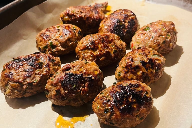 Once they are all rolled, place an oiled oven-safe pan on the stove over medium heat, fry the koftas until golden, rotating every minute to ensure they brown evenly, should take about 7 minutes.