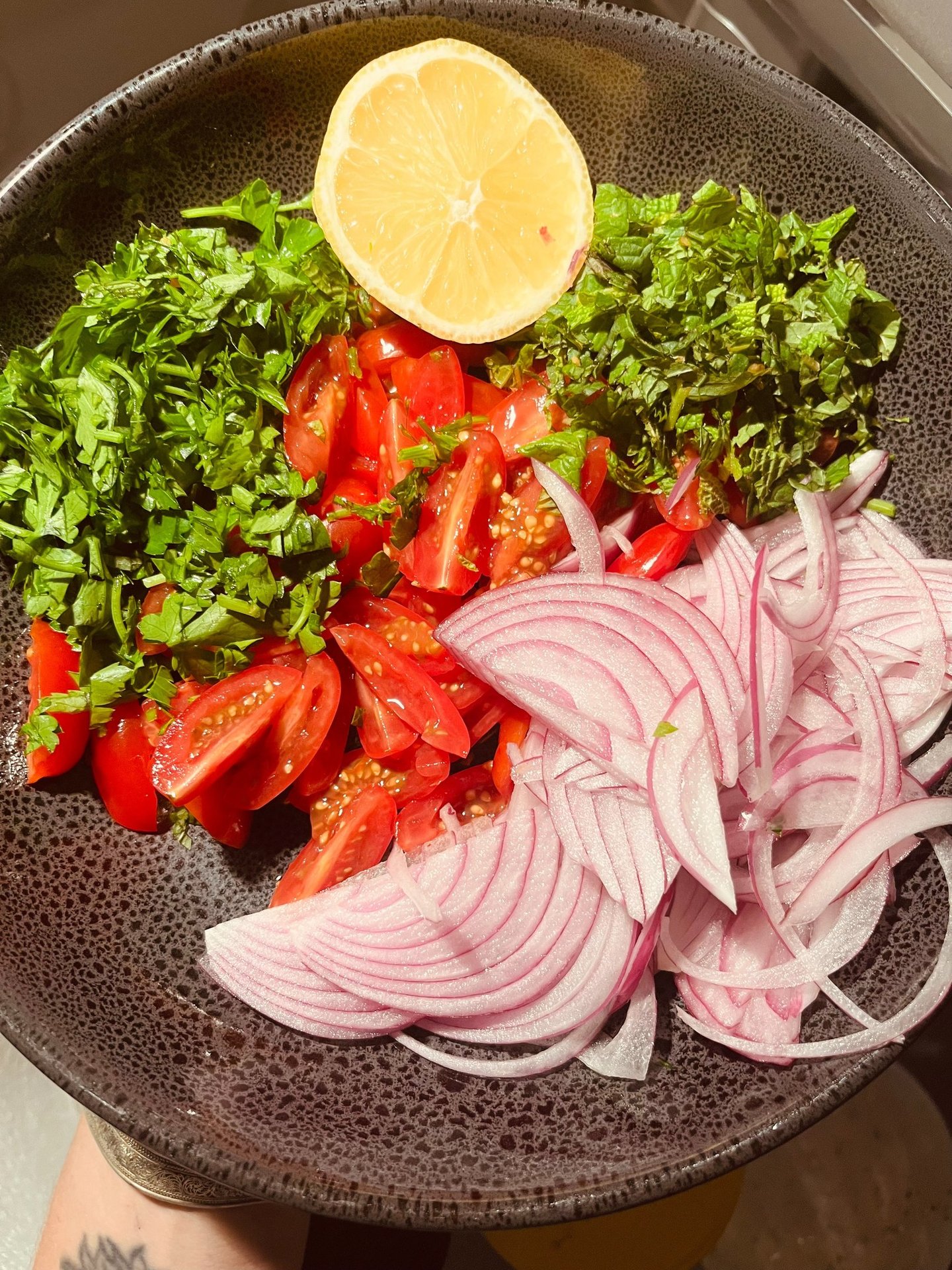 Season with olive oil, lots of salt and pepper and a big squeeze of lemon. Mix well.