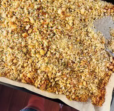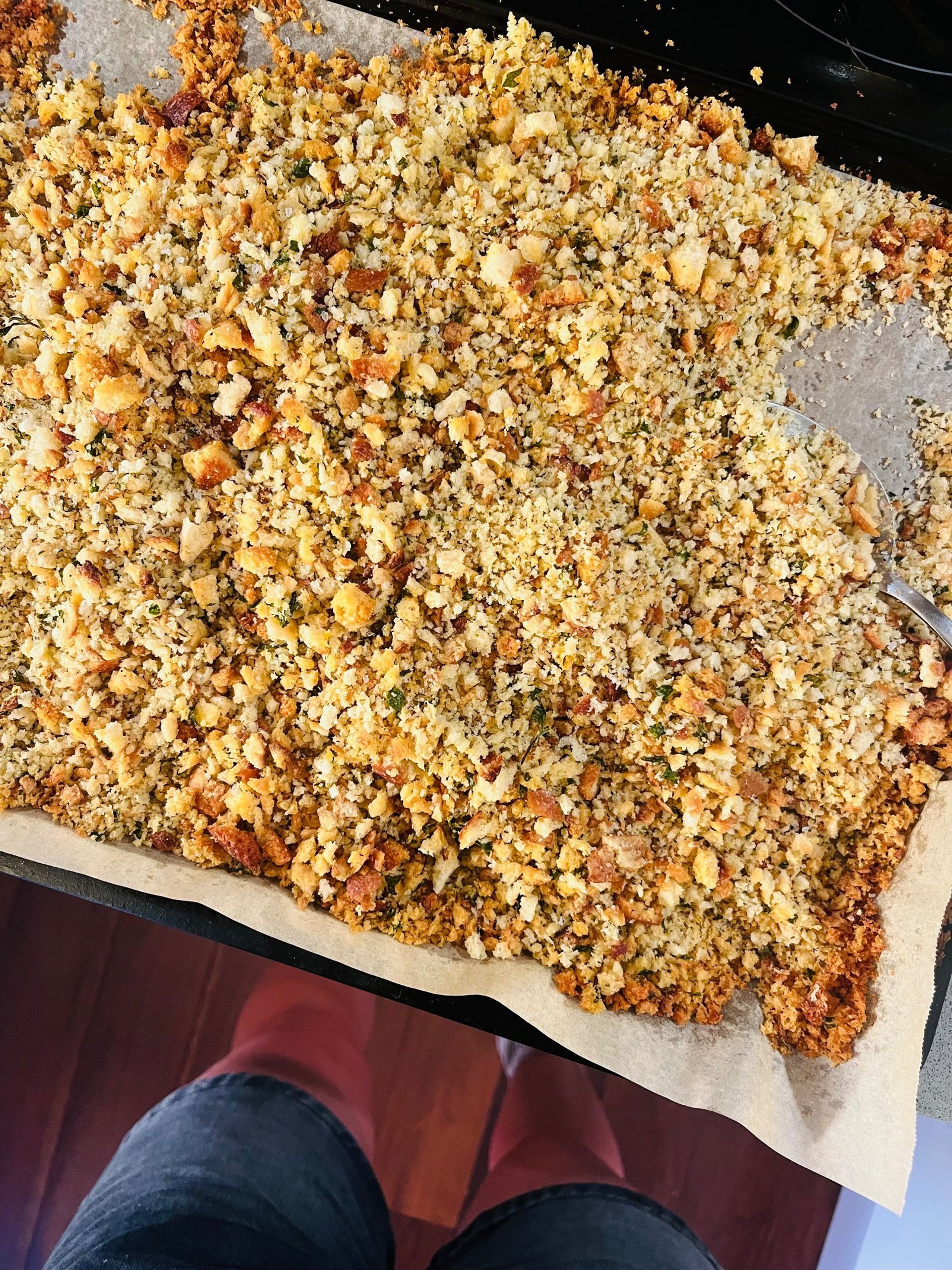 - Scatter the mix into the lined baking tray, bake for 20-25 minutes, carefully mixing the crumbs every 8 minutes or so, brining the crispy edge bits into the centre.