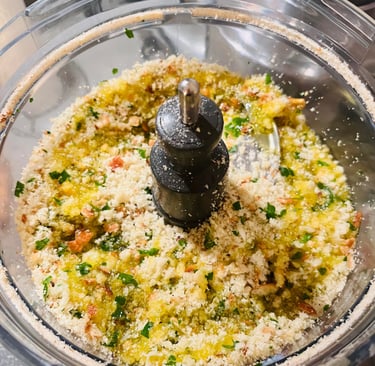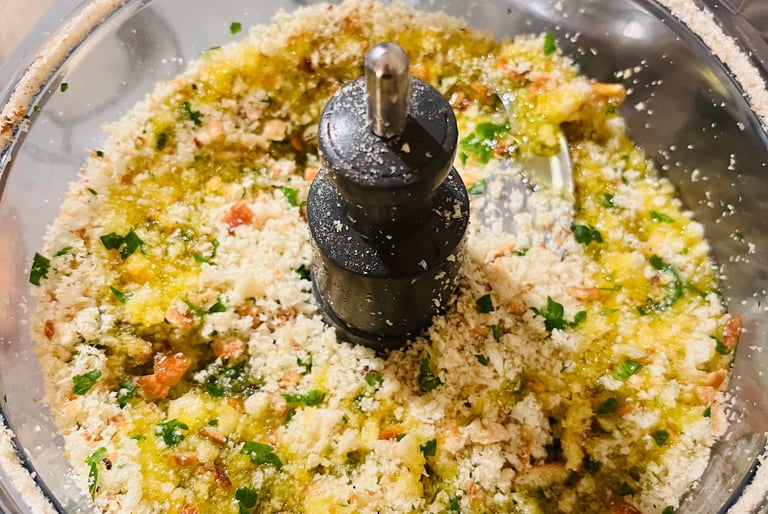 Once all the bread is crumb-like, add the garlic, olive oil and parsley. Pulse until combined.