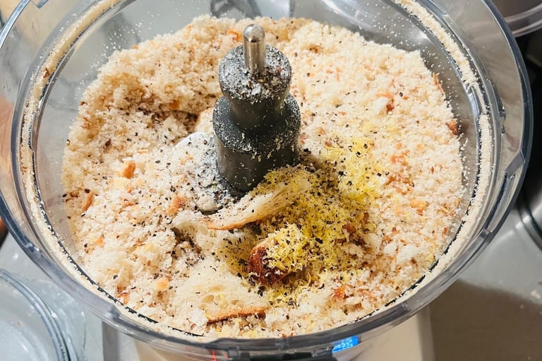 - Break the sourdough up into small pieces. Add a small handful to a food processor, pulse until it resembles crumbs. With the motor running, continue to add all the small pieces of bread (can use nutribullet for small batches).