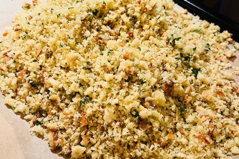 The best crispy garnish that harnesses many powers in making everything you cook even more delicious. Easy to mix up the flavours... add chilli, different herbs, maybe some parmesan. Can also swap the butter for olive oil to make it vegan.