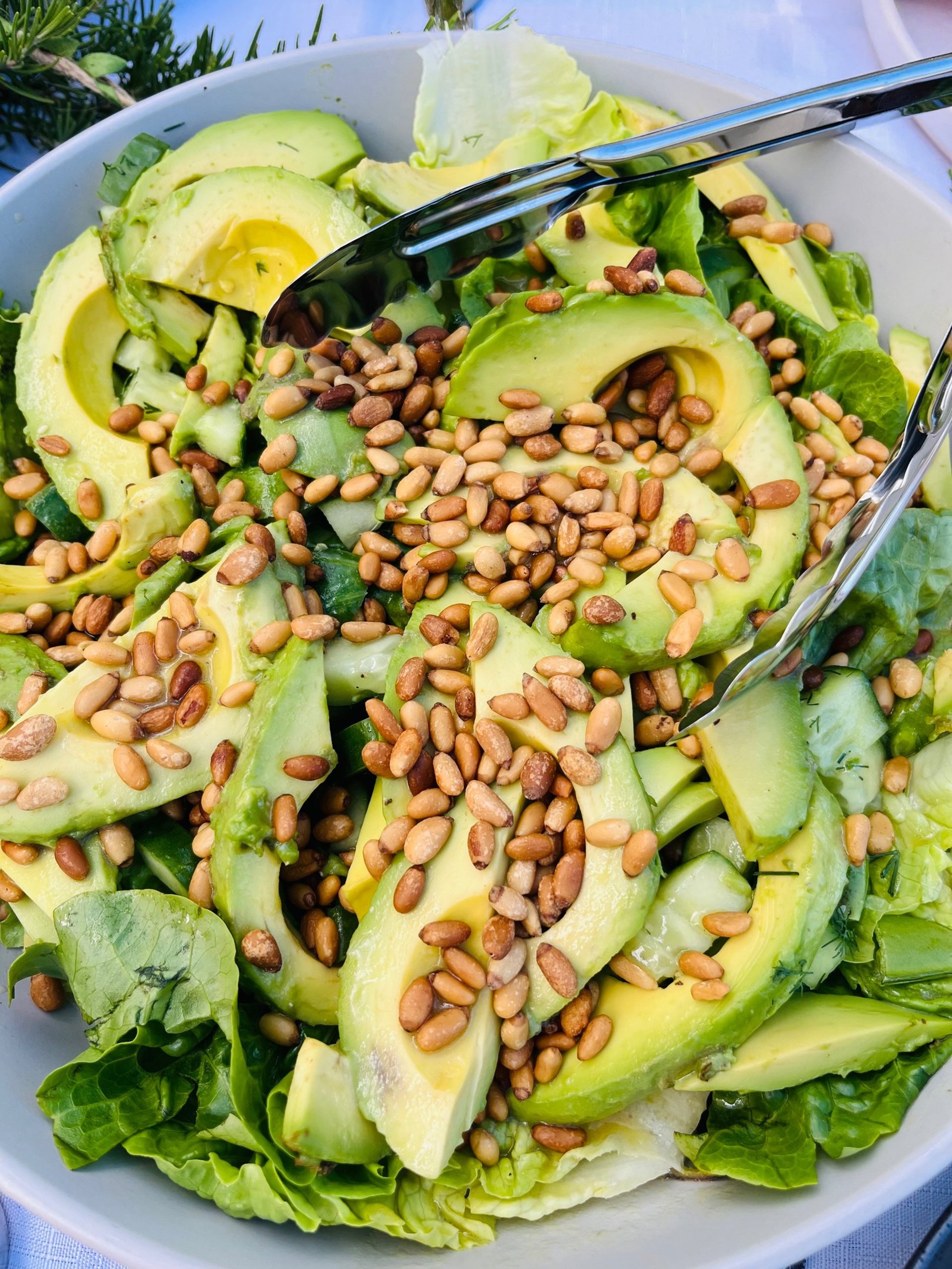 Dress just before serving, top with roasted pine nuts, and if you like, pangrattato (You will NOT regret it).
